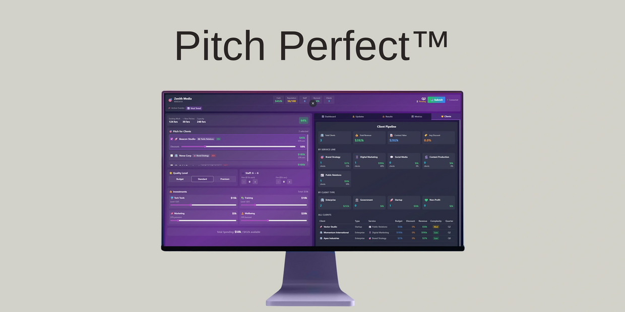 Pitch Perfect is a fast-paced, digital business simulation where agency teams run a virtual marketing agency. Multiple teams compete against each other and choose their strategies for pricing, pitching, staffing, and trading-off growth vs margin.